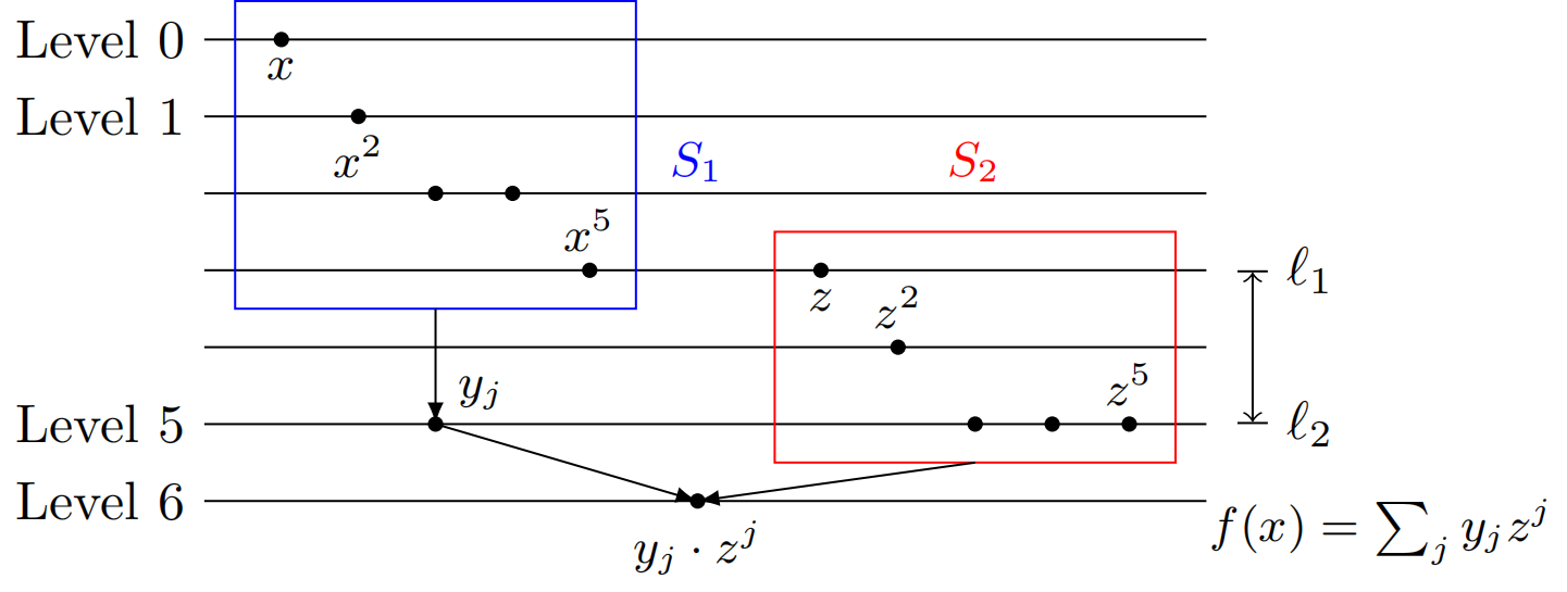 \[S_2:=\{x^e\mid e = i\cdot B^t,\, i = 0,\cdots,\lfloor d/B^t\rfloor\},\]where the multiplicative depth of \(S_1^{(j)}\) is \((j + 1)\cdot\ell''\leq\ell'\), which is \((t - 1)\) levels shallower than the multiplicative depth \(\ell\) of the set \(S_2\). The figure below shows the relative relationship of the multiplicative depths of each set.