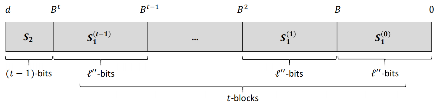 The decomposition of the set \(S\) is not unique. By generalizing the decomposition method in the original BSGS, we present a simple method based on digit decomposition. Suppose \(\ell=\lceil\log d\rceil\), set \(\ell'=\ell-(t - 1)\), \(\ell''=\ell'/t\) and \(B = 2^{\ell''}\). Define the sets