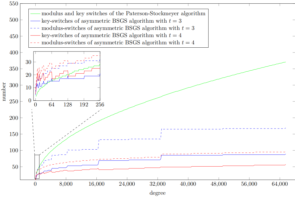 The figure below shows the exact number of modulus switches and key switches in the asymmetric BSGS algorithm with different parameters. Although it performs worse than the Paterson-Stockmeyer algorithm for polynomials of low degrees, as the degree of the polynomial increases, the number of modulus and key switches is only a fraction of that in the Paterson-Stockmeyer algorithm.