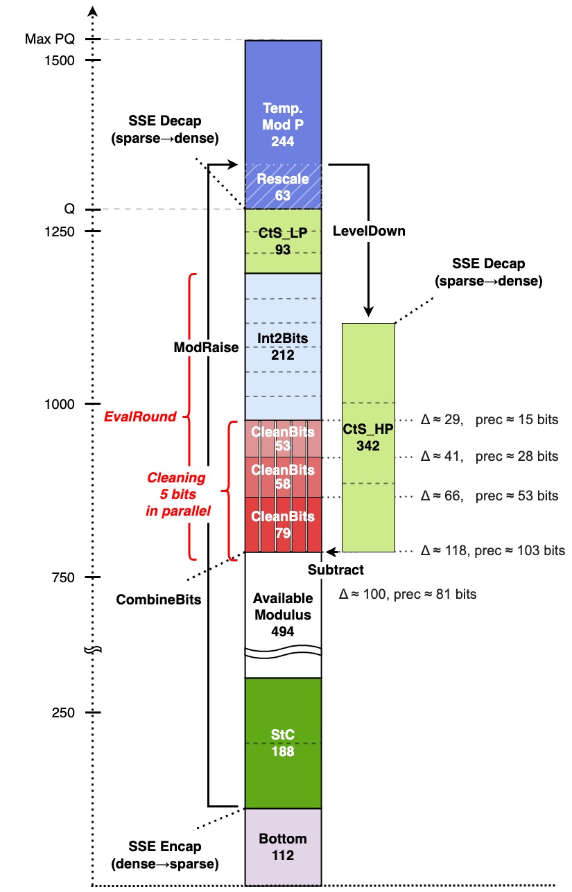 The main challenge is that high-precision bootstrapping still requires substantial modulus. In particular, EvalMod and EvalRound rely on polynomial approximations of \((x \bmod q)\) and \((x - (x \bmod q))\), respectively. Achieving higher accuracy requires higher-degree polynomials, whose multiplicative depth grows as \(\Theta(\log t)\), where \(t\) is the target bit-precision. Since scale factors grow as \(\Theta(t)\), overall modulus consumption typically scales as \(\Theta(t \log t)\).